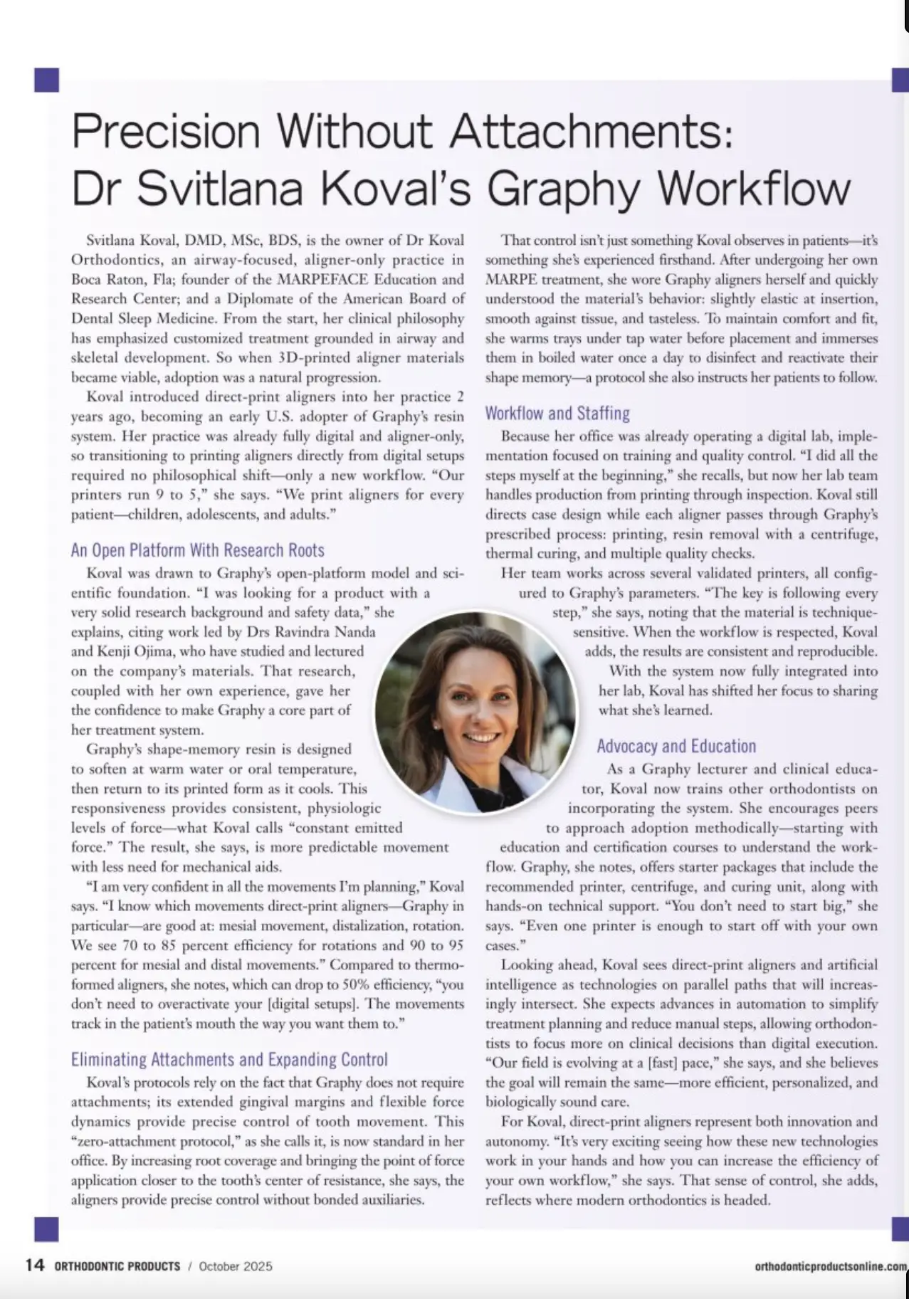 Dr. Koval is featured for her innovative use of 3D-printed direct aligners with Graphy’s advanced resin technology. She discusses her “zero-attachment” workflow that enhances precision, comfort, and efficiency for patients.